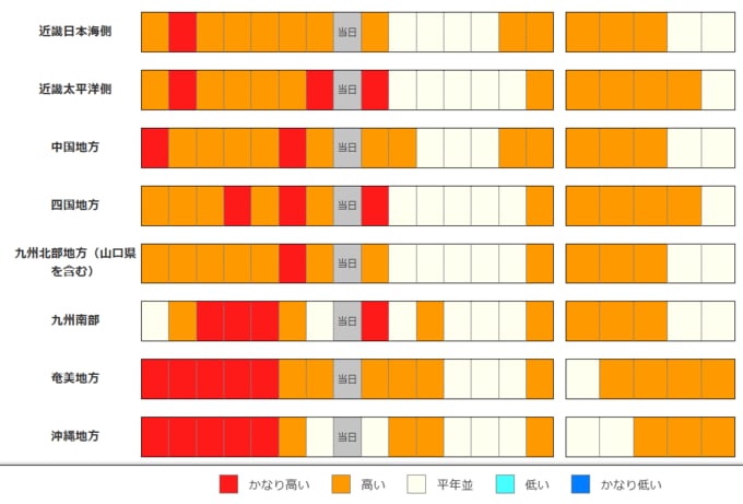 北・東日本の気温は、向こう3日間程度は暖かい空気に覆われやすいため高い日が多く、かなり高い日もあるでしょう。農作物の管理等に注意してください。その後は平年並の日が多くなりますが、4月26日頃からは高い日もあるでしょう。西日本と沖縄・奄美の向こう2週間の気温は、平年並か高いでしょう。