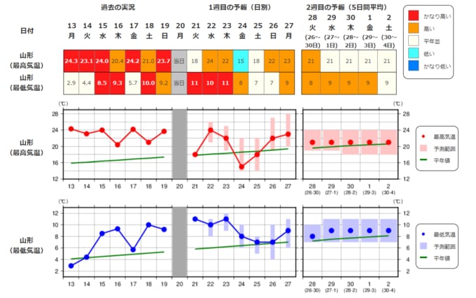 ・最近1週間の実況と今後2週間先までの気温の推移を表示しています。