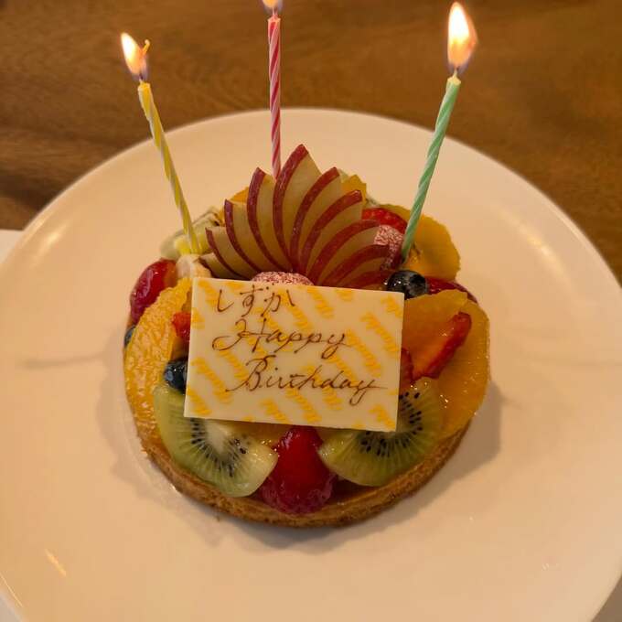 投稿に添えられた写真には、「しずかHappy Birthday」と書かれたプレートとキャンドルが灯った果物のケーキを前に、二人が笑顔でカメラに向かう様子が写っています。