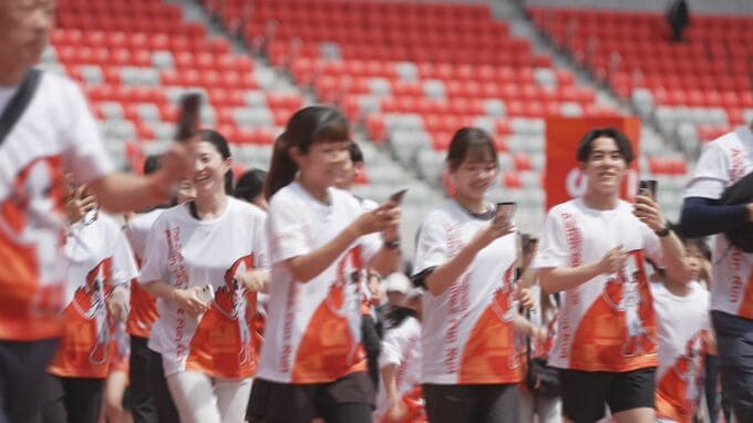 式典後は、アジア大会のPRイベント。1万1000人を超える応募者から選ばれた500人が、完成したばかりのトラックを笑顔で走り抜けました。
