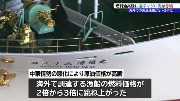 中東の情勢悪化による原油価格の高騰によって、マグロ漁船の燃料として海外で調達するA重油の価格が1kLあたり2倍から3倍に跳ね上がりました。