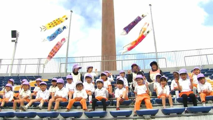 鹿児島市の白波スタジアムに幼稚園児たちがつくったこいのぼりがお目見えしました。「やねよーりーたかーい、こいのーぼりー」白波スタジアムにこいのぼりを掲げたのは鹿児島市のやはた幼稚園の年長27人です。園児…