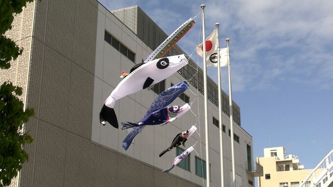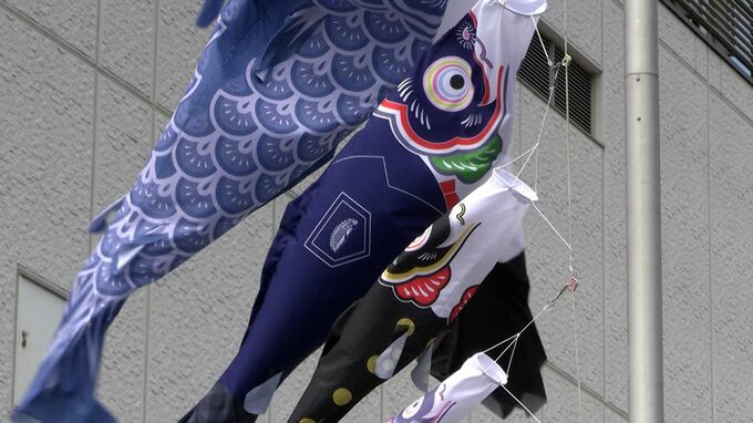 少し変わった柄のこいのぼりが泳いでいます。倉敷市児島味野にある児島市民交流センターにお目見えした「産業こいのぼり」です。ジーンズや学生服、畳縁など地域の繊維産業をPRしようと2020年から掲げられています。