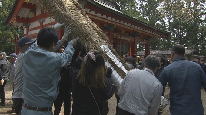 櫻井脩弥アナウンサー「新しいわらに変えるために、今すべてのわらを全員で剥いでいる状況です。見応えがありますね」