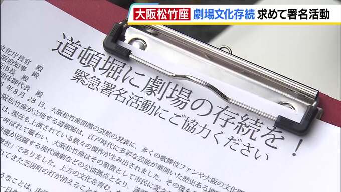 「大阪松竹座」が閉館することを受け、道頓堀の芸術文化を残こしてほしい、と署名活動が行われました。 大阪市中央区でおこなわれた署名活動。閉館する大阪松竹座に代わって、劇場文化を受け継ぐ新たな施設の検討…