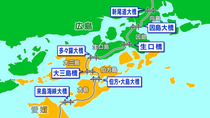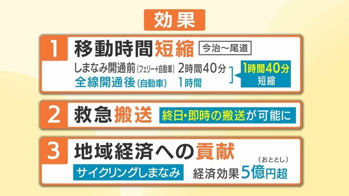 かつてフェリーを乗り継いで2時間40分もかかっていた今治―尾道間は、車でわずか1時間ほどに短縮。