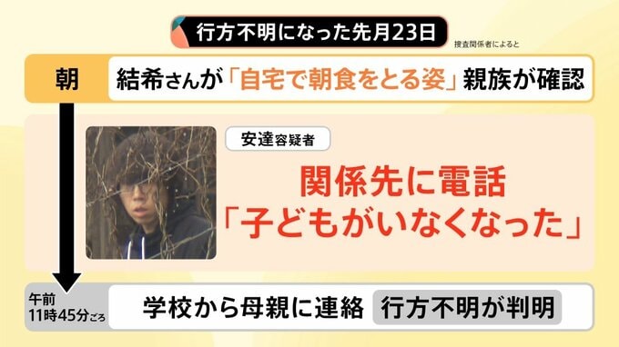 ▼行方不明になった当日の朝、結希さんが「自宅で朝食をとる姿」を親族が確認していました。