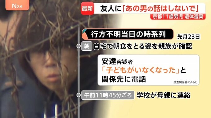 さらに昼前には小学校から「登校していない」と連絡を受けて、安達容疑者が110番通報し、捜索が始まりましたが、捜査関係者によると、安達容疑者は学校から連絡を受ける前に「子どもがいなくなった」と関係先に電話していたということです。
