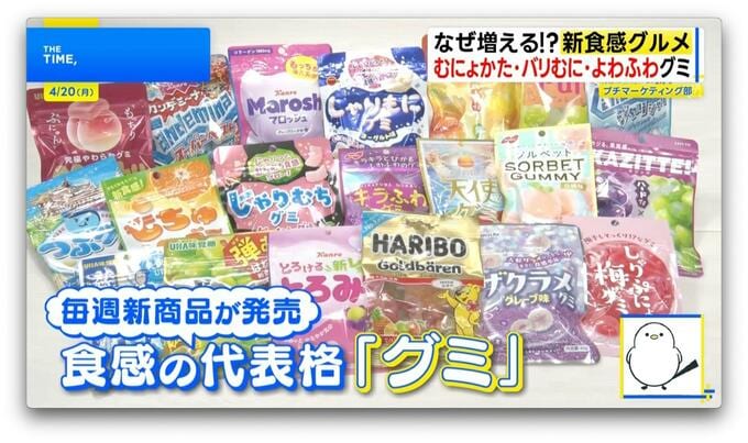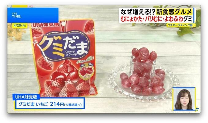 3月に発売された「グミだま いちご」(UHA味覚糖/55g・214円※番組調べ)は、【バリッむに】食感。