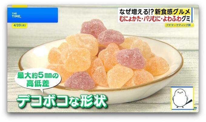 食感の秘密は最大約5mmの高低差がある“デコボコな形状”。噛んだ時のグミの厚さに変化をつけることで口の中でより長く違った食感を楽しむことができるのです。