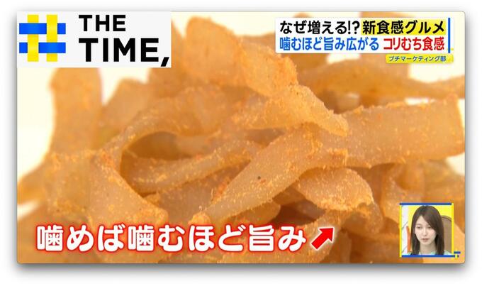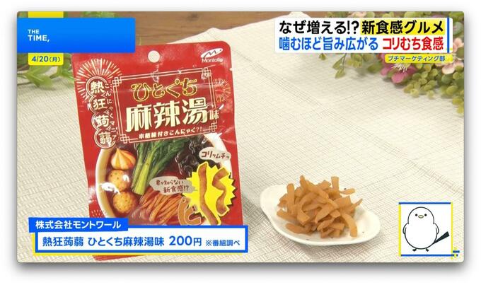 4月に発売された「熱狂蒟蒻 ひとくち麻辣湯味」(株式会社モントワール/8g・200円※番組調べ)は、細長くスライスし乾燥させて味付けしたおつまみコンニャク。その食感はー