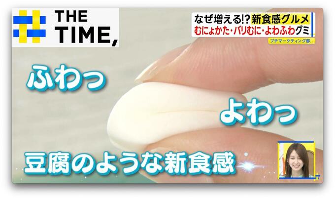 グミ生地に空気を含ませ維持する技術を使うことで、【ふわっよわっ】という、まるで豆腐のような新食感を実現したといいます。