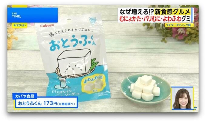 さらに、やわふわ食感が楽しめるのは、「おとうふくん」(カバヤ食品/38g・173円※番組調べ)