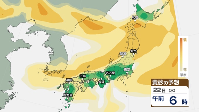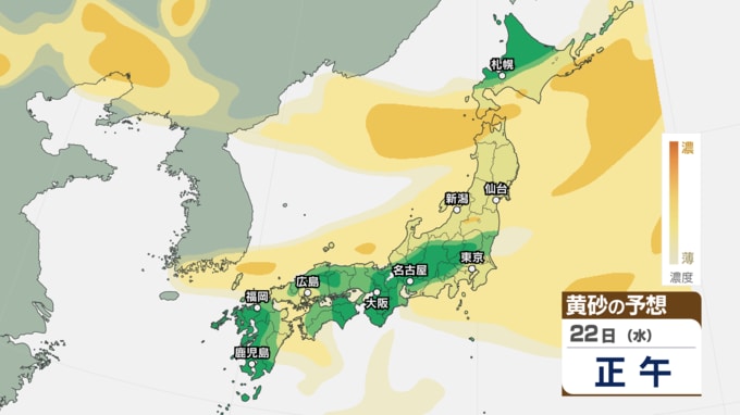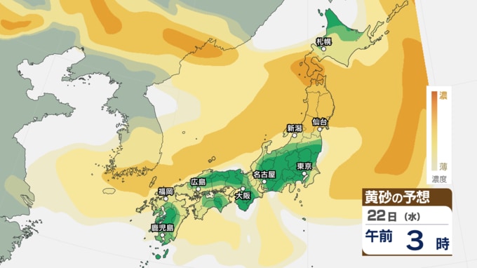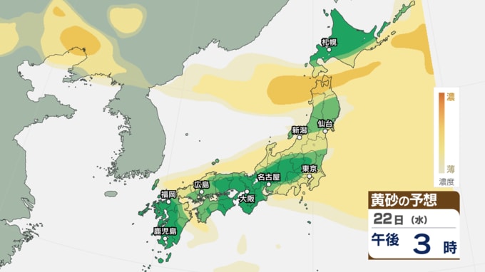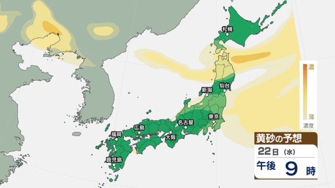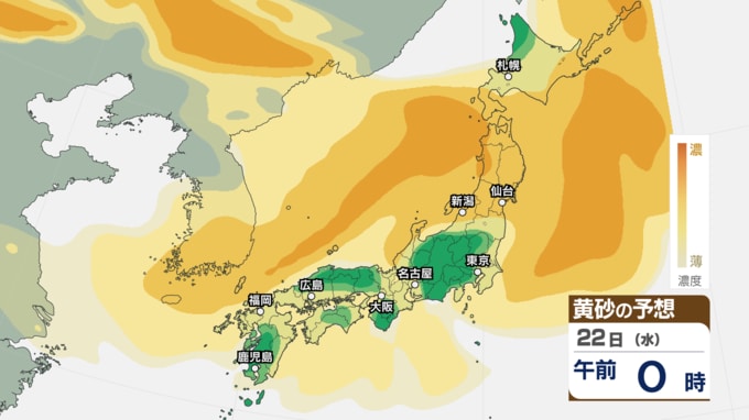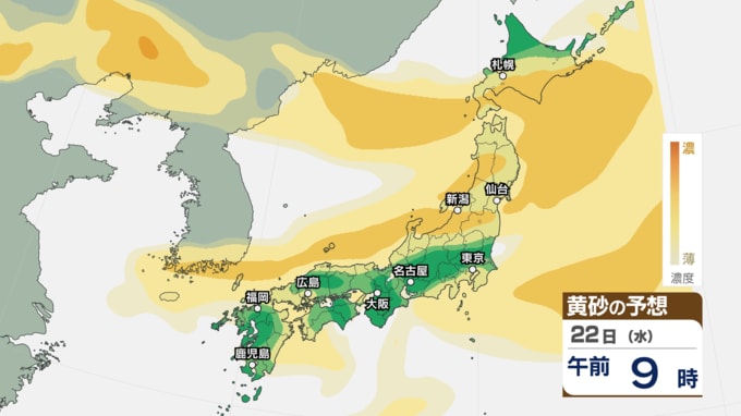 【 黄砂情報 】あす22日にかけて黄砂が北日本~西日本の広範囲に飛来 アレルギーや呼吸器系疾患の人は注意を【黄砂のシミュレーション・21日午前10時40分現在】 新潟放送 2026年4月21日(火) 10:44 国内 天気 22日(水)の黄砂のシミュレーション