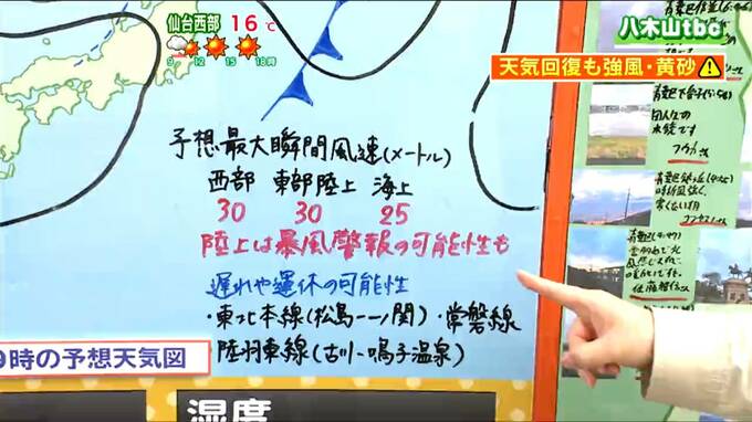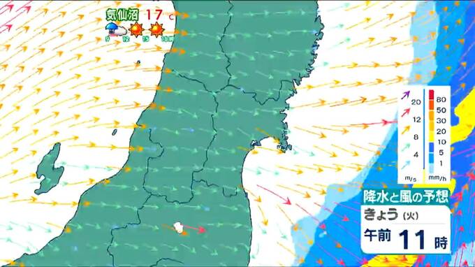 特に石巻から登米にかけてのエリアは、強い西風が吹き抜けやすく、平均で15m前後の風が吹く可能性があります。夜になると徐々に収まる見通しですが、夜遅くにかけても引き続き強風への注意が必要です。海上では波もうねりを伴い3メートルと高くなる予想です。