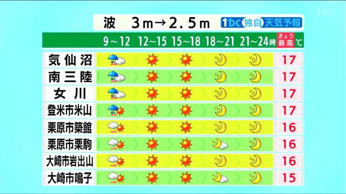 ■登米市米山:17℃ ■栗原市築館:16℃ ■栗原市栗駒:16℃