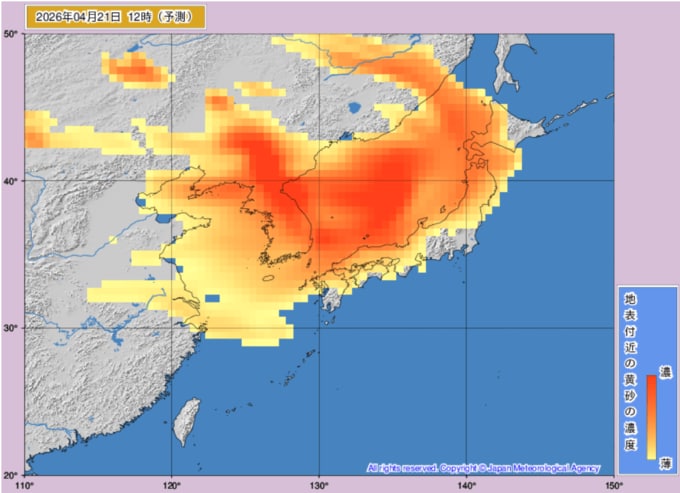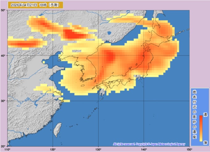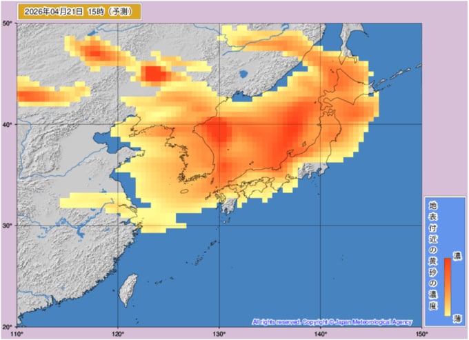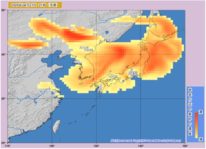 【黄砂情報】黄砂は日本列島の広範囲に飛来か...21日~23日の黄砂シミュレーション いつどこに、どれくらい飛んでくる? 黄砂を上空から見たデータで確認 気象庁発表 全国の天気を画像で テレビユー山形 2026年4月21日(火) 11:05 国内 ■黄砂はいつ・どこに?(21日)