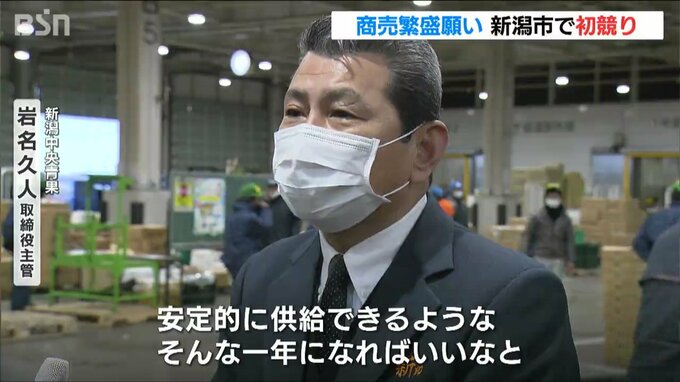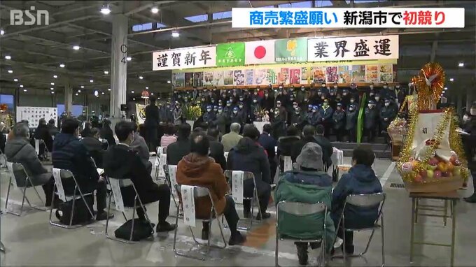 新潟市で新春恒例の初競りが行われ、市場関係者は新型ウイルスの終息と今年一年の商売繁盛を願いました。