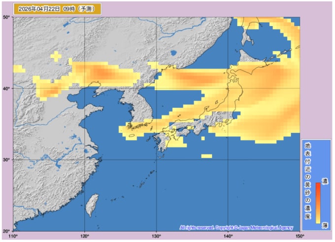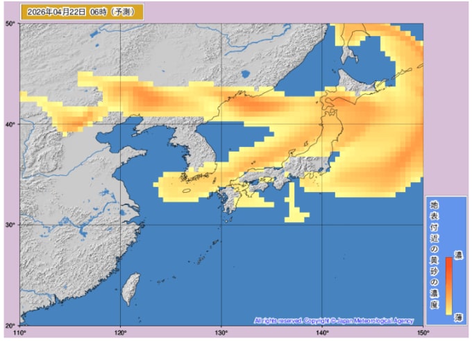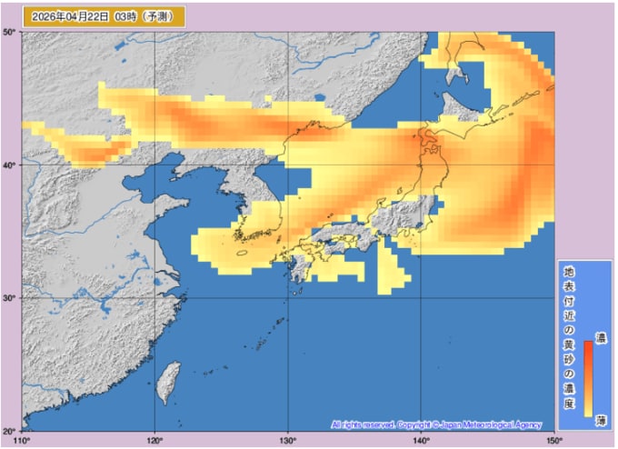 【黄砂情報】東京、大阪、札幌、長崎などで黄砂観測【21日(火)~23日(木)黄砂シミュレーション】気象庁の黄砂解析予想図「黄砂に関する全般気象情報」