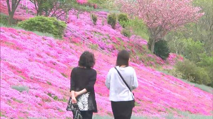赤や淡いピンクの花びらが美しい、シバザクラです。高松市西植田町(にしうえたちょう)の「カフェジャルダン」では1.5ヘクタールの庭園に約30万株のシバザクラが咲き誇り、多くの人が訪れています。