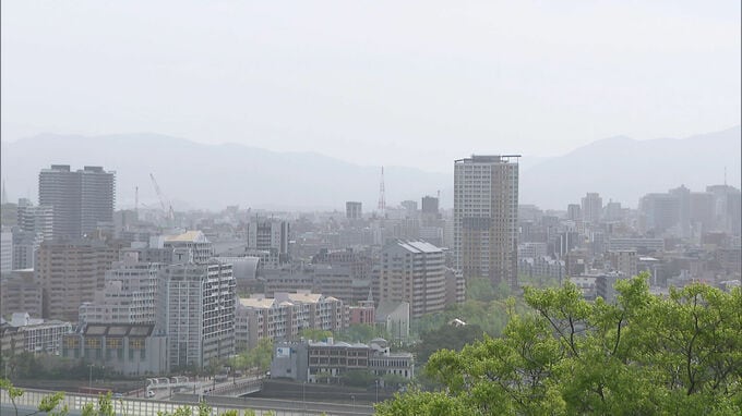 「午前9時過ぎの福岡市内です。空はやや白っぽく見え遠くの建物がかすんで見えています」