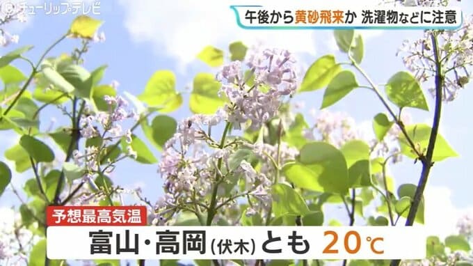 日中の予想最高気温は富山・高岡市伏木ともに20℃ですが午後からは黄砂の飛来が予想され洗濯物に気をつける必要があります。