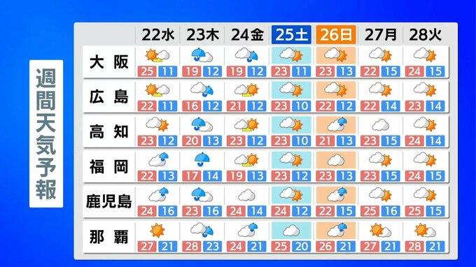 木曜日から金曜日は低気圧や前線の影響で、広い範囲で雨が降る見込みです。西日本では木曜日は発達した雨雲がかかり、大雨となる所がありそうです。