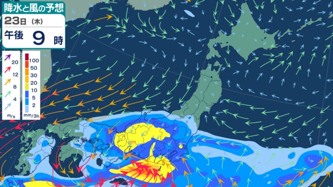 発達する低気圧や、そこに流れ込む暖かく湿った空気の影響で、西日本~東日本、南西諸島では23日に雷を伴った激しい雨・非常に激しい雨の降る所があることが予想されています。