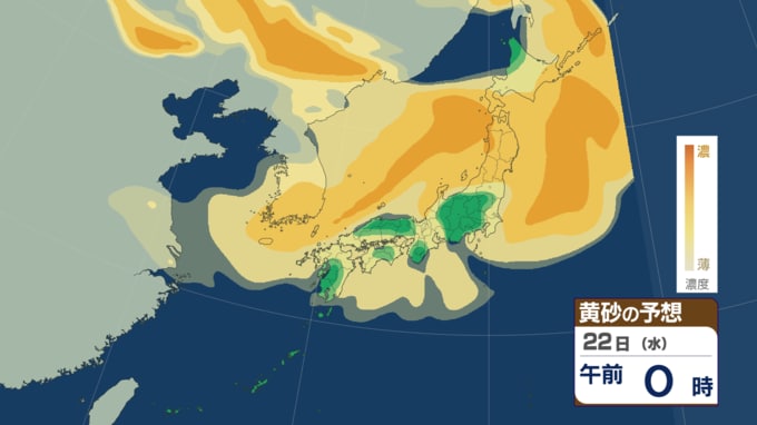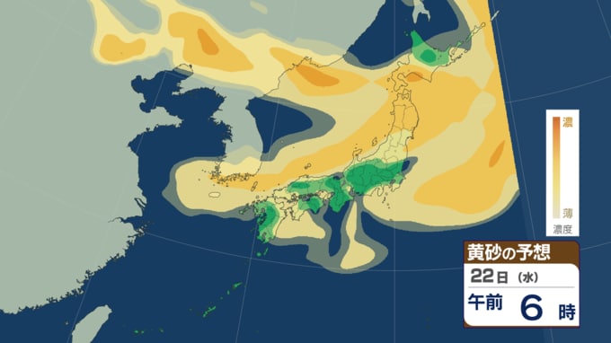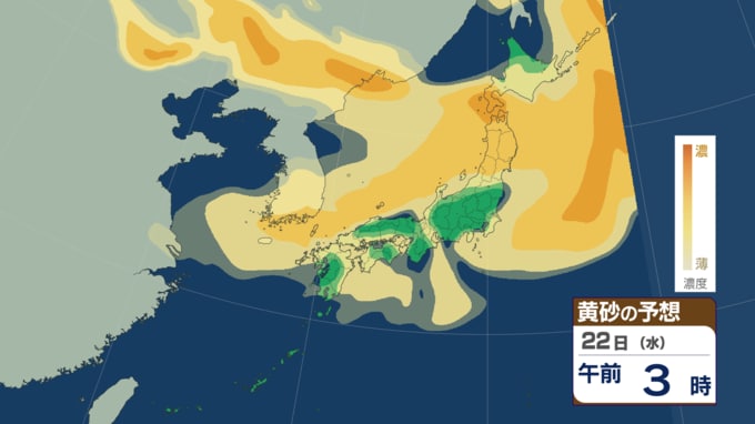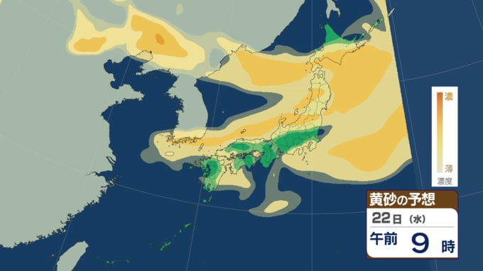 【黄砂・雨情報】黄砂のあとは雨が降る? 23日にかけてほぼ全国に黄砂飛来の可能性 高濃度の黄砂飛来が予想される所も その後は西日本~東日本で雨か【黄砂・雨の最新予想シミュレーションあり】 青森テレビ 2026年4月21日(火) 14:30 国内 【4月22日(水)午前】黄砂の予想シミュレーション ♦黄砂の予想シミュレーション (4月21日・22日・23日・24日) ♦雨・風の予想シミュレーション ♦記事を最初から読む