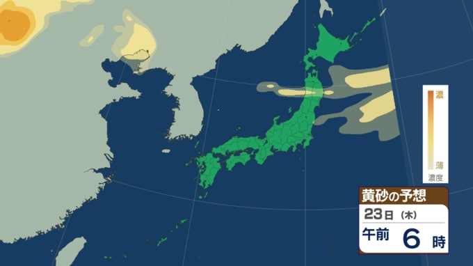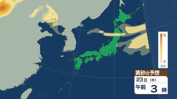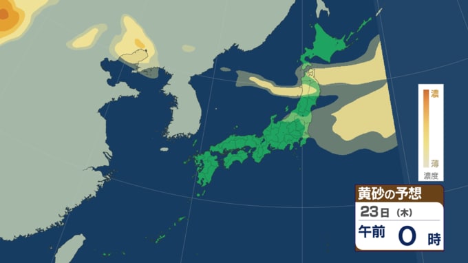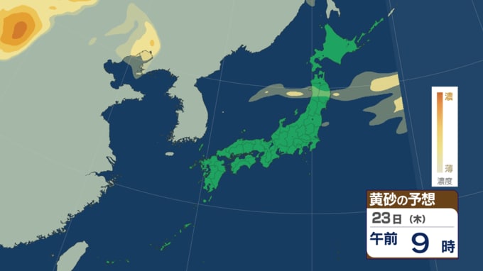 【黄砂・雨情報】黄砂のあとは雨が降る? 23日にかけてほぼ全国に黄砂飛来の可能性 高濃度の黄砂飛来が予想される所も その後は西日本~東日本で雨か【黄砂・雨の最新予想シミュレーションあり】 青森テレビ 2026年4月21日(火) 14:30 国内 【4月23日(木)午前】黄砂の予想シミュレーション ♦黄砂の予想シミュレーション (4月21日・22日・23日・24日) ♦雨・風の予想シミュレーション ♦記事を最初から読む