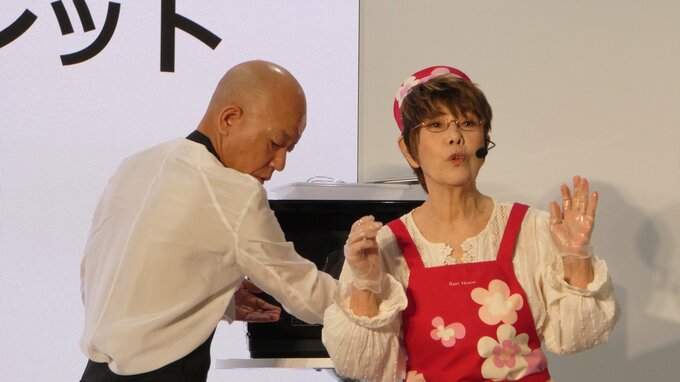 イベントでは、平野さんによる、電子レンジを使ったオムレツの時短クッキングも開催。〝これ使う予定だったんだけど出番無いんですって!〟と言いながら、調理で使う予定のない〝レミパン〟片手に登場した平野さん。
