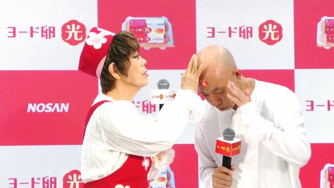 バイきんぐの小峠英二さん、料理愛好家の平野レミさんが21日、日本発のブランド卵発売50周年記念「ヨード卵・光 新CM発表会」に登壇しました。