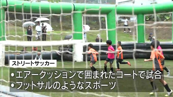 ストリートサッカーは、四方をエアークッションに囲まれた狭いコートで行われるフットサルのようなスポーツで、攻守の切り替えが早く、得点のチャンスが多いのが特徴です。