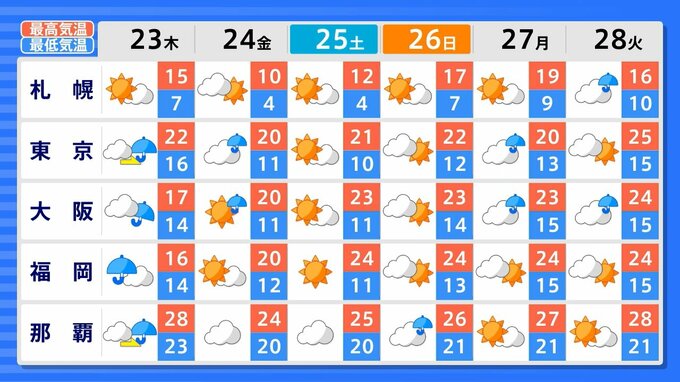 ただし、週末の25日から26日にかけては一時的に高気圧に覆われ、晴れる所がある見通しです。
