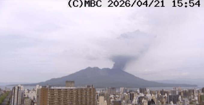 気象台によると、桜島の南岳山頂火口で21日午後3時45分に爆発的噴火があり、噴煙が火口から2700mの高さまで上がりました。大きな噴石が南岳山頂火口より500から700mの8合目まで飛散し、やや多量の噴煙が南東に流れています。