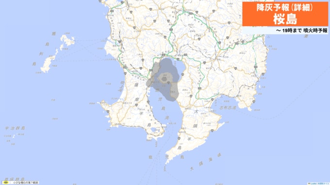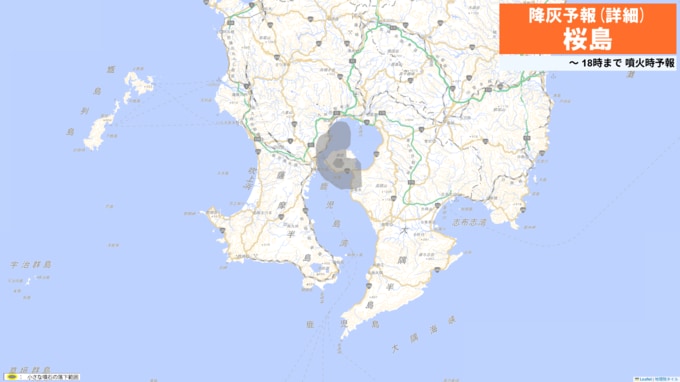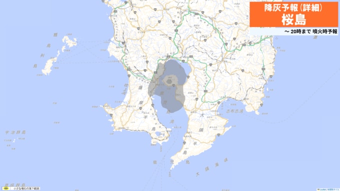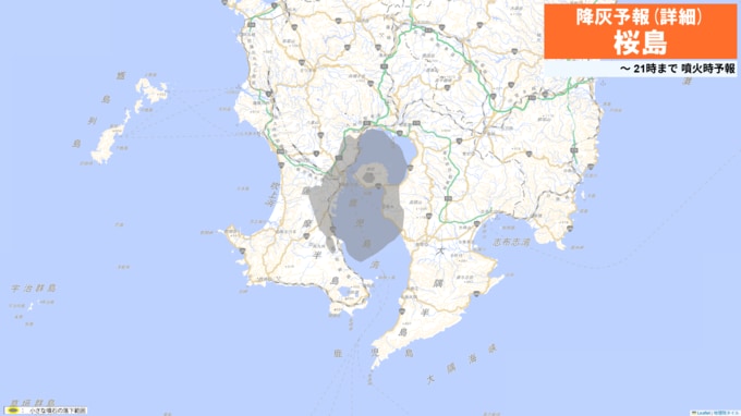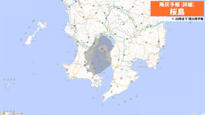 火口から南西方向(鹿児島市谷山方向)に火山灰が流され、21日22時までに鹿児島市(桜島)ではやや多量の降灰があり、降灰は鹿児島県指宿市まで予想されます。