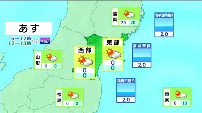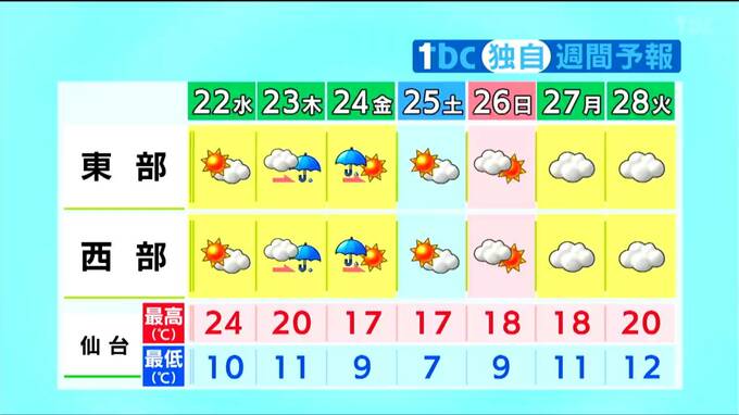 最低気温は、21日朝より3℃前後低い所が多く、平年並みか高いでしょう。最高気温は、21日より5℃前後高く、仙台では、今年一番の暖かさとなりそうです。