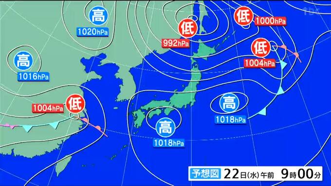 22日午前9時の予想天気図です。高気圧に覆われる所が多いでしょう。北海道や九州地方では、低気圧や前線の影響を受ける見込みです。