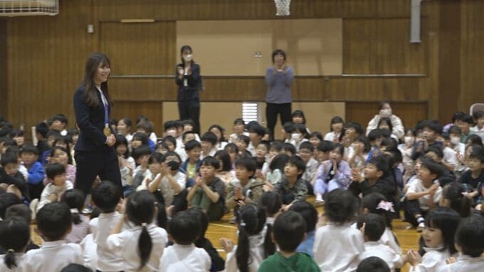 21日は母校の児童ら約600人に金メダルを披露し、質問にも答えるなど終始和やかな時間を過ごしました。