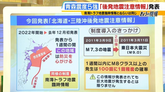 今回の地震を受けて、気象庁は「北海道・三陸沖後発地震注意情報」を発表しました。これは2022年に運用が開始された制度で、今回が2度目の発表。同様の制度に「南海トラフ地震臨時情報」があります。
