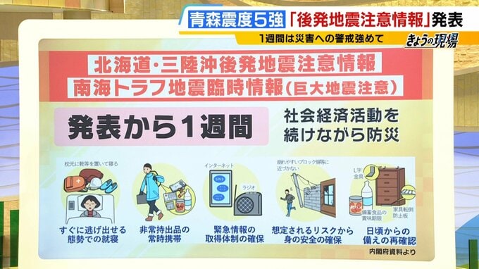 「北海道・三陸沖後発地震注意情報」の対象エリアは、北海道から千葉県にかけての計182の市町村。このエリアでは、1週間、地震への備えを再確認したうえで、以下のような防災対応をとることが求められています。