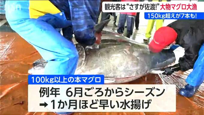 新潟県佐渡市で4月21日朝、大物の本マグロが水揚げされ、港が賑わいました。