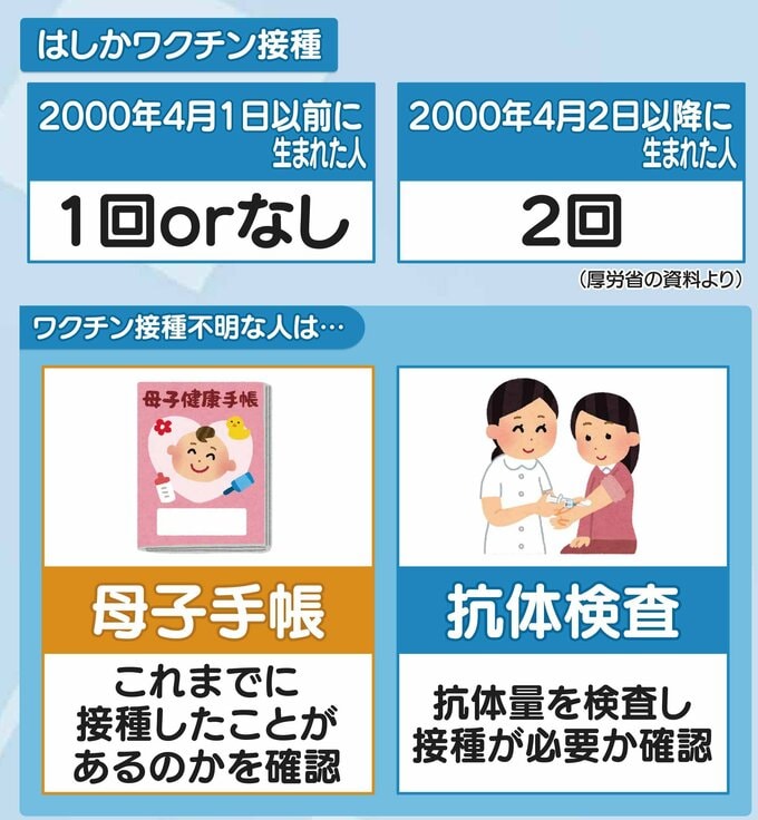 厚労省によると、はしかのワクチン接種は、生まれた年代によって回数が異なります。