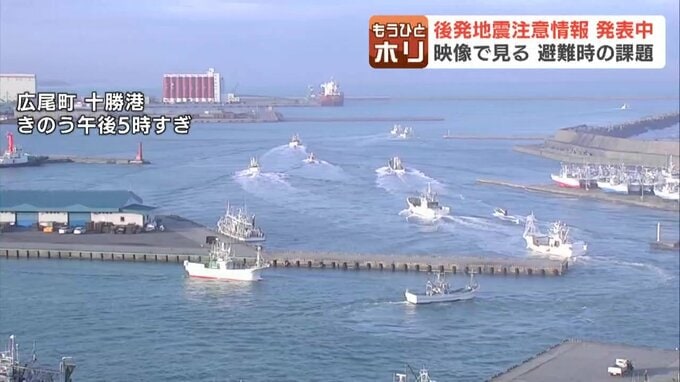 広尾町の十勝港でも、漁船が次々と沖へ避難します。