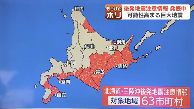 だいたい普段、この可能性が0.1%だとすると、今はその10倍、1%になっている、そんなイメージです。道内でこの対象となるのは、太平洋沿岸部、それから道東の内陸部、そしてオホーツク海側の一部など、色をつけた63の市町村です。最悪の場合、死者が出ると予想されるエリアです。