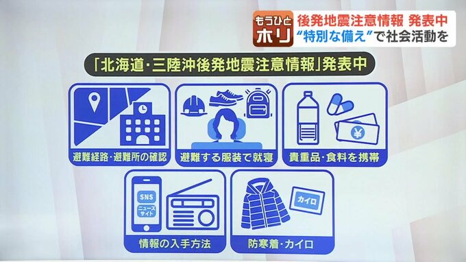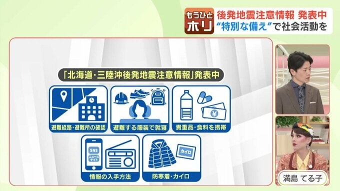 高橋教授によると、今回は岩手県沖の地震ですけれども、これは次の巨大地震の可能性っていうのは何も岩手県沖だけではなくて、北海道、釧路、根室、ここも巨大地震の発生可能性のエリアになりますので、それを念頭に置きながら、対象地域を問わずに準備をしてくださいということです。では改めて、どんな準備が必要なのでしょうか。