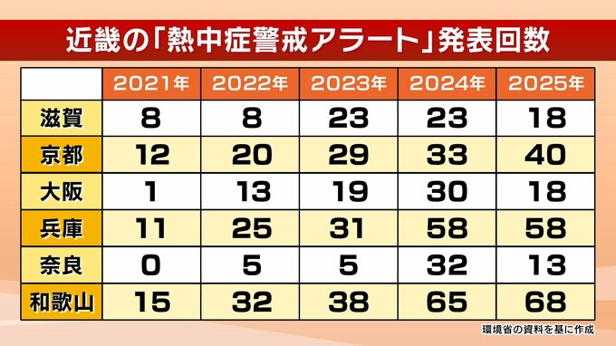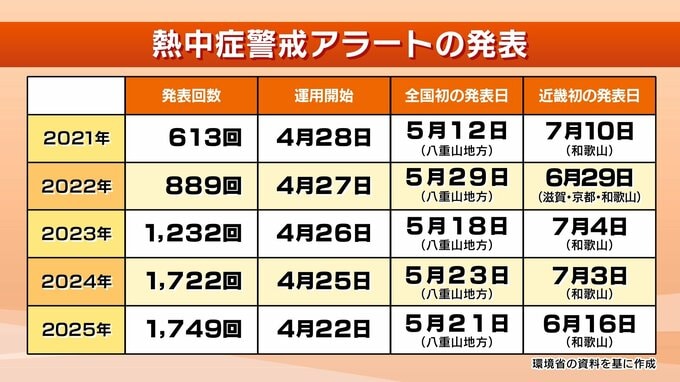 熱中症警戒アラートは2021年に全国で運用が始まり、おもに都府県単位の全国58区域が対象です。これまでの発表回数は、全国で2021年が613回、2022年は889回、2023年は1232回、一昨年は1722回、去年は1749回と、年々回数が増え、去年は2021年と比べると3倍近くまで増えました。
