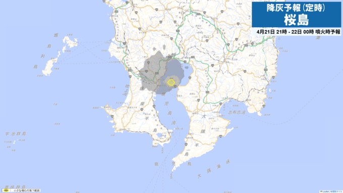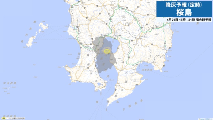 21日18時から22日12時までに噴火が発生した場合には、以下の方向・距離に降灰及び小さな噴石の落下が予想されます。