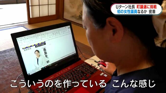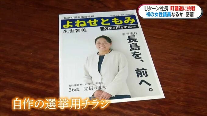 自作の選挙用チラシに掲げたテーマは、「女性の声を町政へ」。子育て支援や地域経済の活性化などを訴えます。