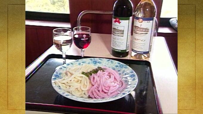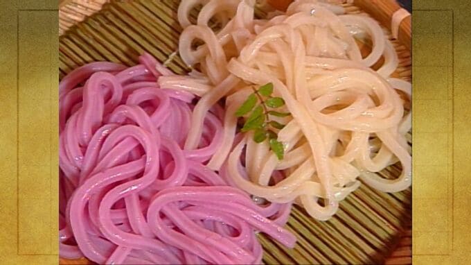 さぬき市といえばワイン。赤白のワインを練りこんだうどんでした。